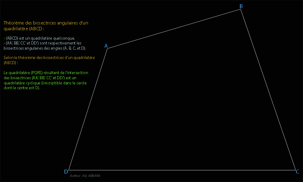 - (AA’, BB’, CC’ et DD’) sont respectivement les bissectrices angulaires des angles (A, B, C, et D).