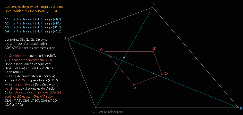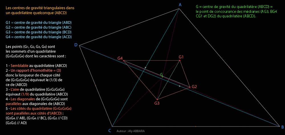 2 - Un rapport d’homothétie = (3) ⇒ la longueur de chaque côté de (G1G2G3G4) équivaut au (1/3) de ce du quadrilatère (ABCD).