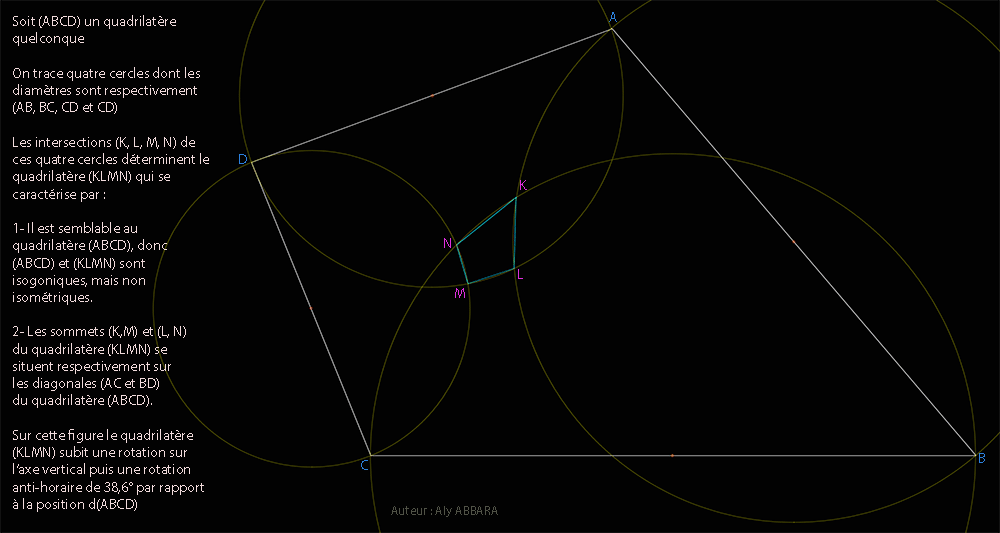 Les intersections (K, L, M, N) de ces quatre cercles déterminent le quadrilatère (KLMN) qui se caractérise par :
