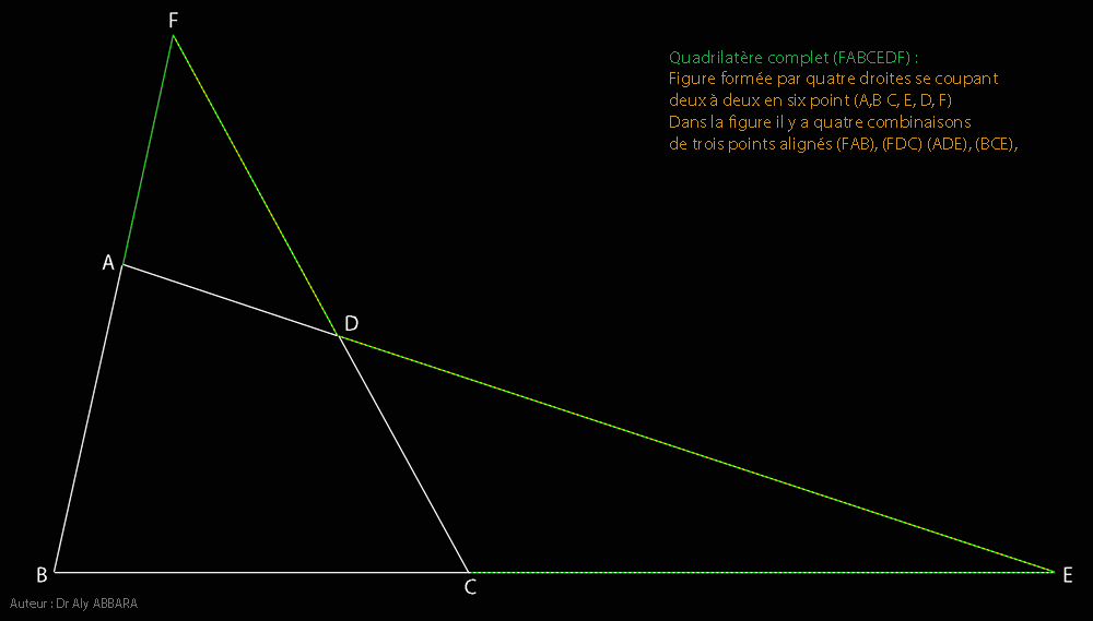 Définition : Figure formée par qutre droites se coupant deux à deux en six points (A,B,C,D,E et F). Il résulte de ces intersection quatre combinaisons de trois points alignés (FAB), FDC), (ADE) et (BCE).