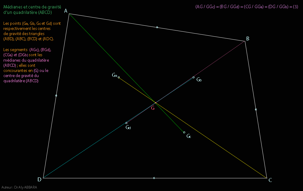 Les segments (AGc), (BGd), (CGa) et (DGb) sont décrits comme étant les médianes du quadrilatère (ABCD).
