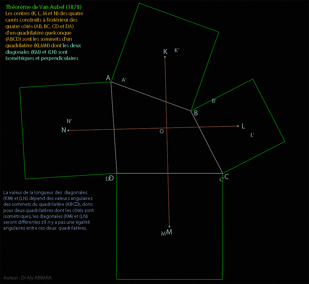 (K, L, M et N) sont les centres des quatre carrés construits à l'extérieur des quatre côtés (AB, BC, CD et AC) du quadrilatère (ABCD).