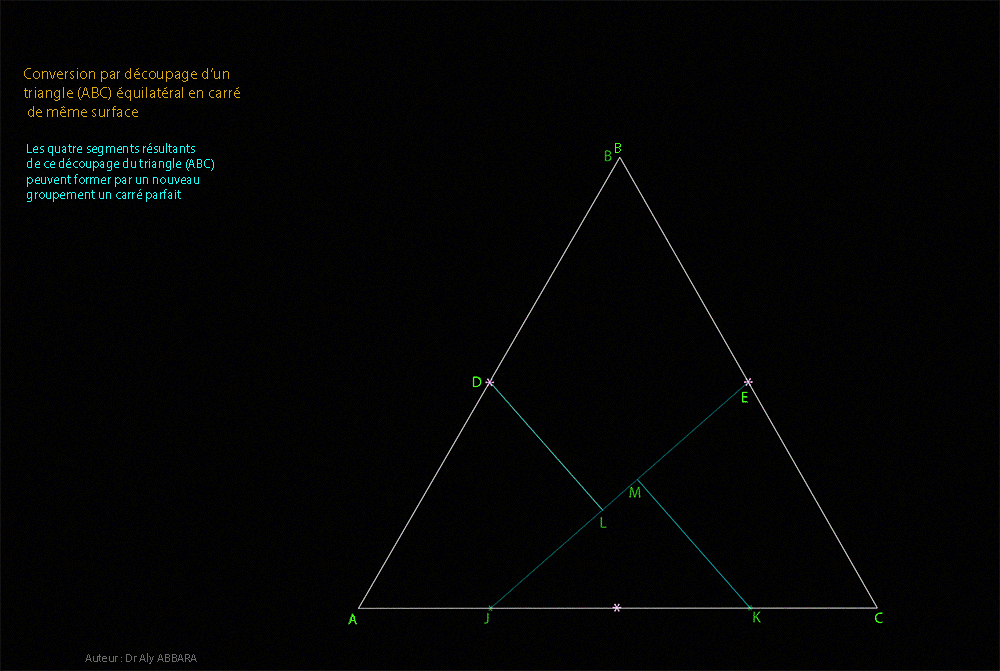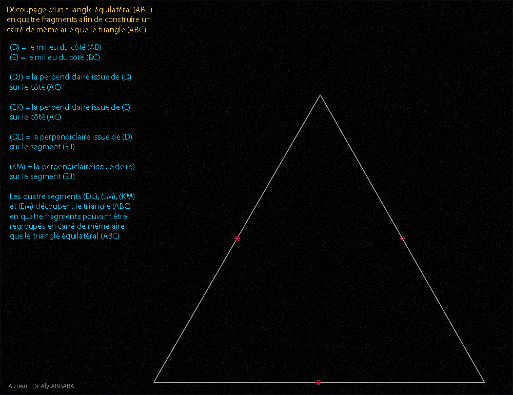 Les quatre fragments résultants de ce découpage du triangle (ABC) peuvent former, par un nouveau groupement, un carré parfait dont l'aire est égale à celle du triange équilatéral (ABC).
