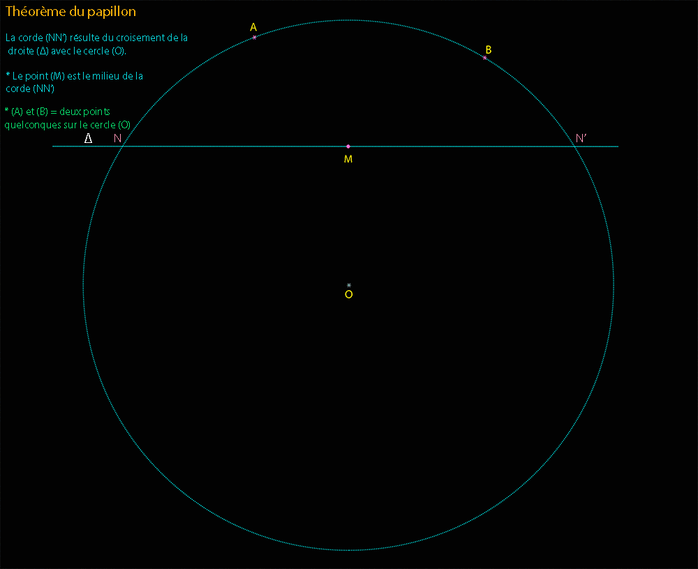 * Théorème du papillon La corde (NN') résulte du croisement de la droite (delta) avec le cercle (O) * Le point (M) est le milieu de la corde (NN') * (A) et (B) = deux points quelconques sur le cercle (O) * La droite (AM) croise le cercle (O) en (C) * La droite (BM) croise le cercle (O) en (D) * La droite (AD) croise (NN') en (E) * La droite (BC) croise (NN') en (F) En déterminant deux autres points [(A') et (B')] sur le cercle (O) * La droite (A'D') croise (NN') en (E') * La droite (B'C') croise (NN') en (F') Selon le théorème du papillon : « Le point (M) est le milieu du segment (EF) et également le milieu du segment (E'F') ». On peut remarquer sur la figure ci-dessus que : * L'angle (A) = (B) ; l'angle (C) = (D) ; l'angle (A') = (B') et l'angle (C') = (D'). * Le quadrilatère (ABCD) croisé en (M) et inscrit dans le cercle (O) est composé de deux triangles [(AMD) et (BMC)] semblables (isogonaux). * Le quadrilatère (A'B'C'D') croisé en (M) et inscrit dans le cercle (O) est composé de deux triangles [(A'M'D') et (B'M'C')] semblables (isogonaux).