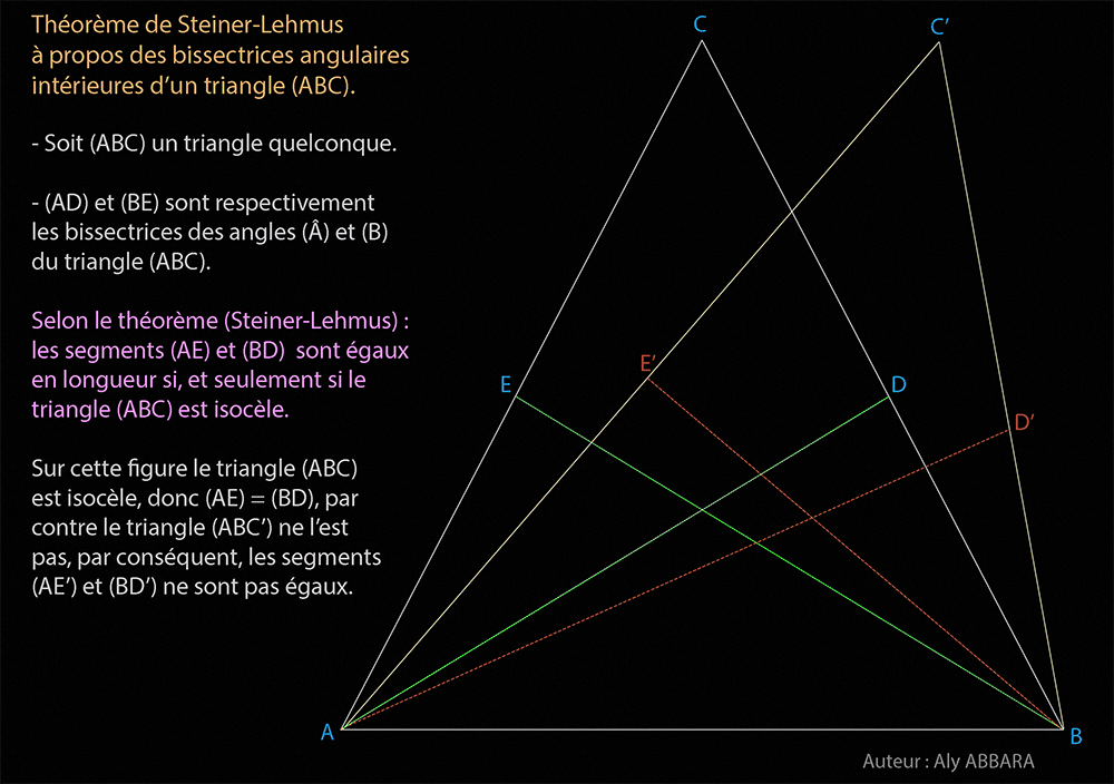 Sur la figure ci-dessus le triangle (∆-ABC) est isocèle, donc (AE) = (BD), par contre le triangle (∆-ABC’) ne l’est pas, par conséquent, les segments (AE’) et (BD’) ne sont pas égaux.