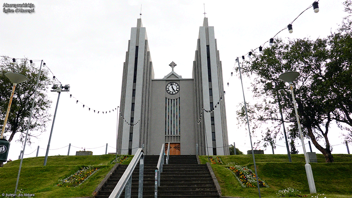 - Il s'agit d'un église luthérienne située dans le nord de l'Islande ; au centre-ville d'Akureyri, perchée sur une colline haute de 112 marches. Un édifice de style Art déco reproduisant le motif de basalte Colonnaire, typique de la nature islandaise.