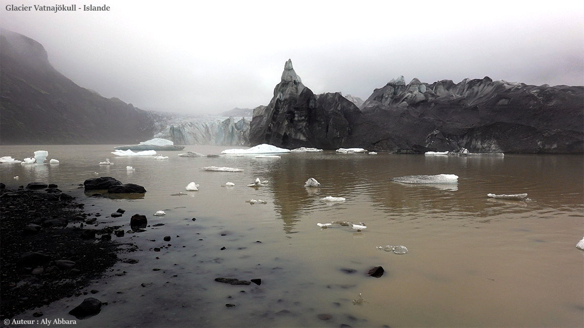 • Les masses de glaces qui se trouvent au bord du glacier et dans le lac glaciaire sont sur ces images, en grande partie, noircies par le cendre volcanique et témoignent des activités volcaniques dans le passé.