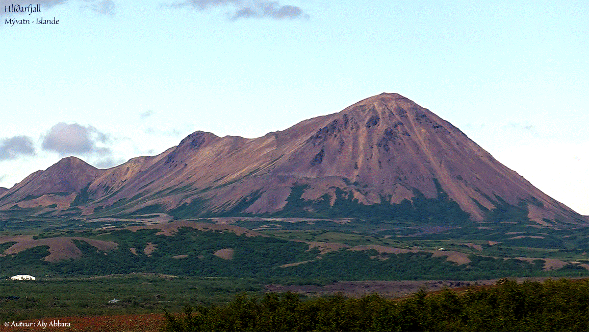 - Hlíðarfjall est de couleur rougeâtre (brun clair) avec une couverture végétale qu'on peut observer au niveau du tiers inférieur de ses pentes ; ce n'est pas le cas pour presque la majorité des volcans de la région du lac Mývatn, excepté la montagne « Vindbelgjarfjall ».