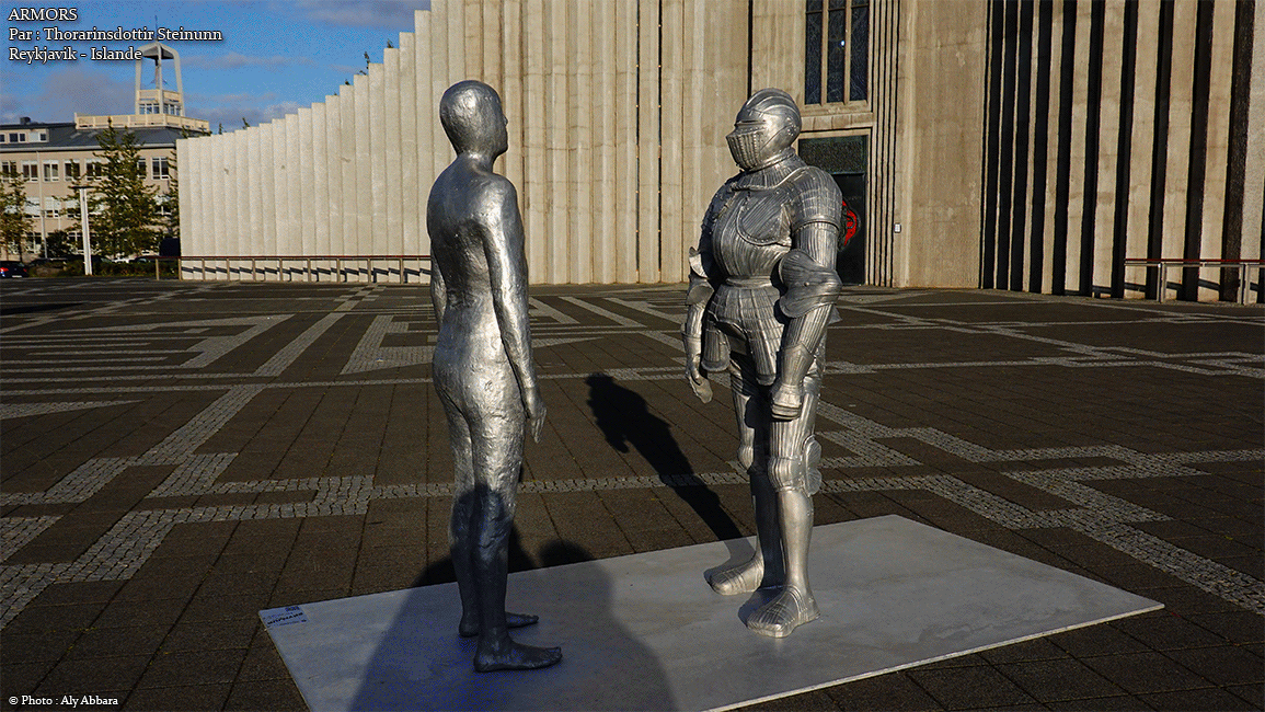 - ARMORS est une célèbre collection d'art médiéval exposée au pied de la façade de la grande église « Hallgrímskirkja » à « Reykjavik ». Il s'agit de quatre personnages (deux paires) de grandeur nature, en fonte d'aluminium. Chaque paire est composée d'une figure portant un casque fermé et en armure complète le cachant complètement ; habituellement cette armure à casque peut indiquer qu'il s'agit d'un combattant moyenâgeux de sexe masculin. Ce personnage est droit sur ses pieds et en face (et probablement en discussion) avec un deuxième personnage également debout, mystérieux, sans tenue militarisée et aux caractères physiques ne permettant pas d'identifier son sexe masculin ou féminin.