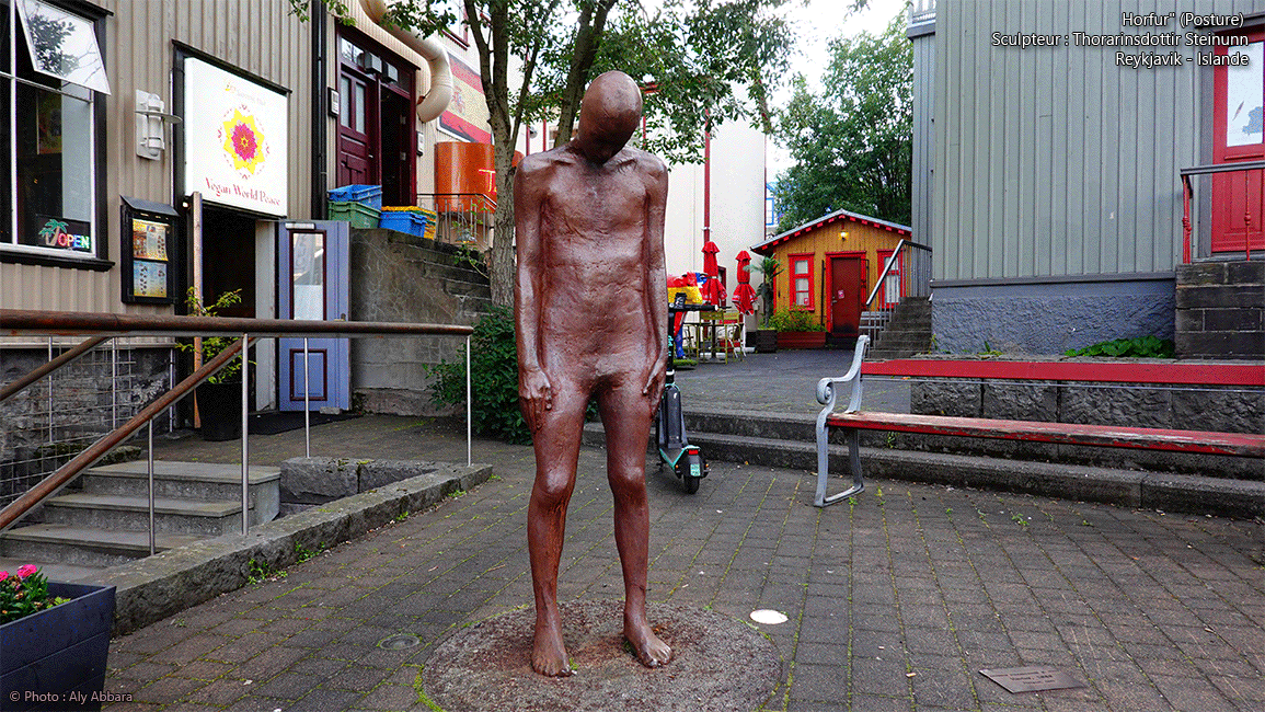 - L'auteur de cette sculpture appelée « HORFUR - Posture » est la sculptrice islandaise « Steinunn Thórarinsdóttir » ou « Steinunn Þórarinsdóttir » : née à Reykjavik en 1955 ; elle est bien appréciée dans son pays et dans le monde. Elle a vécu en Angleterre et en Italie où elle a suivi sa formation de sculpteur et a exposé ses travaux en Europe, au Japon, aux États-Unis et en Australie.