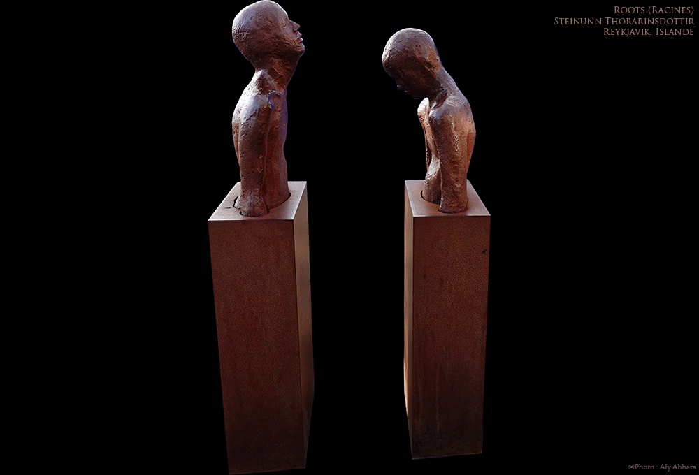 - L'auteur de cette sculpture appelée « ROOTS - Racines » est la sculptrice islandaise « Steinunn Thórarinsdóttir » ou « Steinunn Þórarinsdóttir » : née à Reykjavik en 1955 ; elle est bien appréciée dans son pays et dans le monde. Elle a vécu en Angleterre et en Italie où elle a suivi sa formation de sculpteur et a exposé ses travaux en Europe, au Japon, aux États-Unis et en Australie.