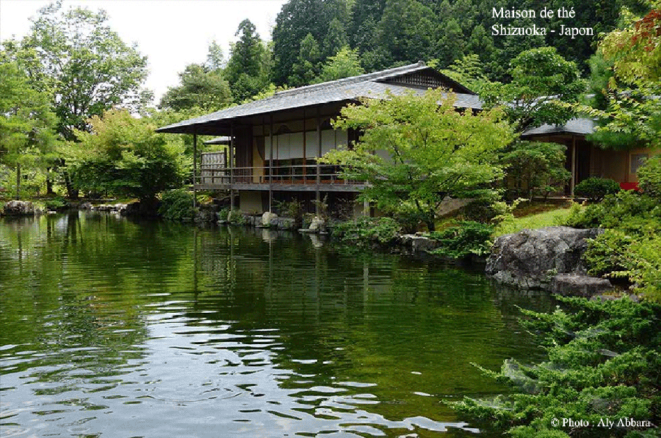 Une maison du thé à kurashiki au Japon بيت من البيوت اليابانية التي يقام فيها إحتفالات شرب الشاي الأخضر ؛ تزيينات الحواجز الخارجية تمثل المراحل الثلاثة للدورة القمرية : شروق القمر ؛ القمر البدر و غروب القمر |
