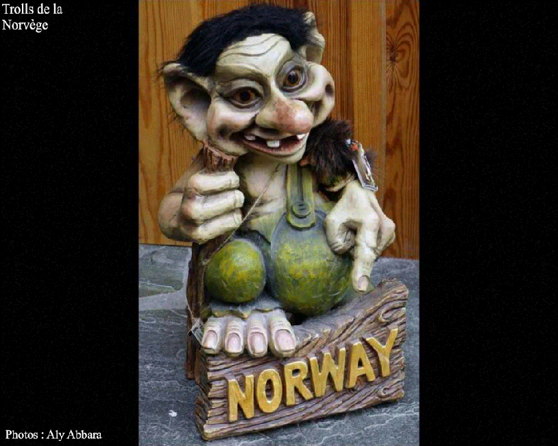 « La plus norvégienne de toutes les créatures surnaturelles de Norvège est le troll, apparu à la fin de la dernière glaciation. Les trolls vivent dans les forêts obscures, près de lacs éclairés par la lune, dans les fjords profonds, sur les pics enneigés et dans le rugissement des cascades. Ce sont des créatures de l'ombre et de la nuit : un troll exposé directement à la lumière du soleil est immédiatement pétrifié.