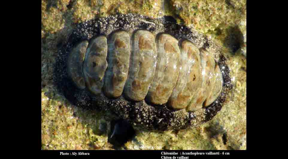 Mer Rouge et Mer d'Arabie ; taille environ 6 cm. Il s'agit d'un mollusque marin de la classe des polyplacophores