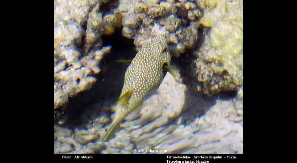 - Tétrodon à taches blanches (Arothron hispidus) : lieu de vie, Mer Rouge et Mer d'Arabie, dans tous les types d'habitats et surtout dans les zones sableuses entre récif et herbiers, à une profondeur de 2 à 50 mètres. Il se nourrit de tous les organisme marins, morts ou vivants