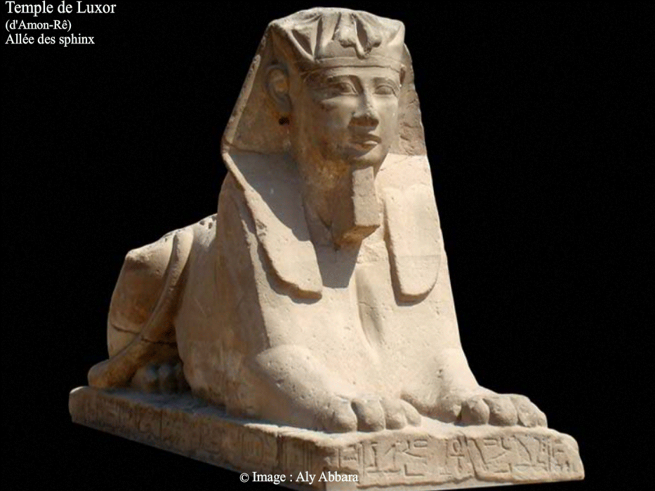 | Égypte -Luxor (Louksor) - deux exemplaires de sphinx (lion androcéphale) de l'allée des sphinx du temple de Luxor (ou temple d'Amon-Rê) qui fut déblayé en 1883 par Gaston MASPERO. La construction de ce temple est due à Aménophis III (1386 - 1349 av. J.-C. - XVIIIe dynastie) puis à Ramsès II (1279 - 1212 av. J.-C. - XIXe dynastie) qui acheva l'édification du temple en y ajoutant la grande cour à portique. Le temple de Luxor était relié au temple de Karnak par une allée pour les processions, bordée de sphinx à l'origine par des sphinx criocéphales que la XXXe dynastie les remplaça par les sphinx androcéphales (à tête humaine) que l'on observés aujourd'hui. |