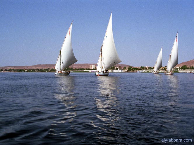 sur le Nil : les felouques (ou falucas), petits bâtimenets, long et légers, à voiles et à rames)