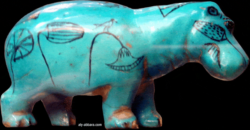 - puis animal terrifiant (lion, crocodile et hippopotame), pour prouver qu'il s'agit d'une déesse féroce, capable de défendre les femmes, les enfants et le foyer familial en écartant et en anéantissant toutes les forces et les génies du mal et tous les êtres dangereux et nuisibles.