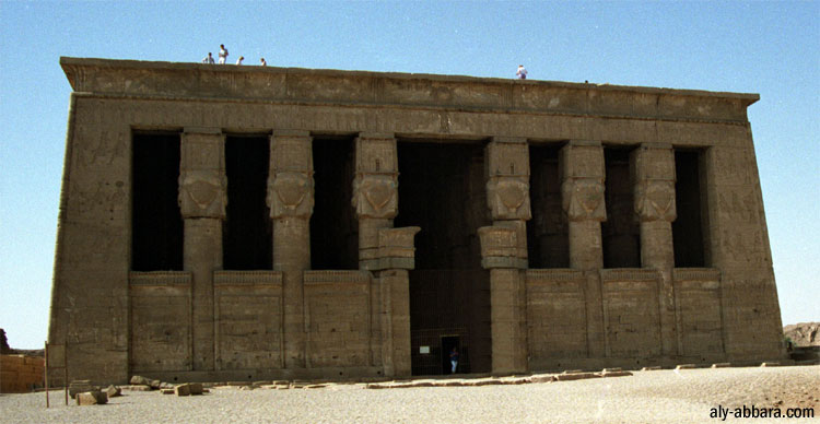 la salle hypostyle avec ses deux paires de trois colonnes hathorique