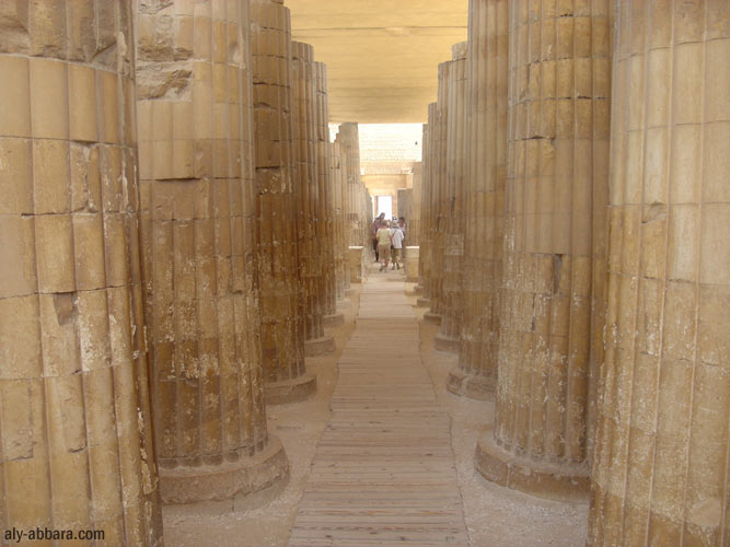 huit colonnes puis sur la cour de la pyramide du roi Djoser.