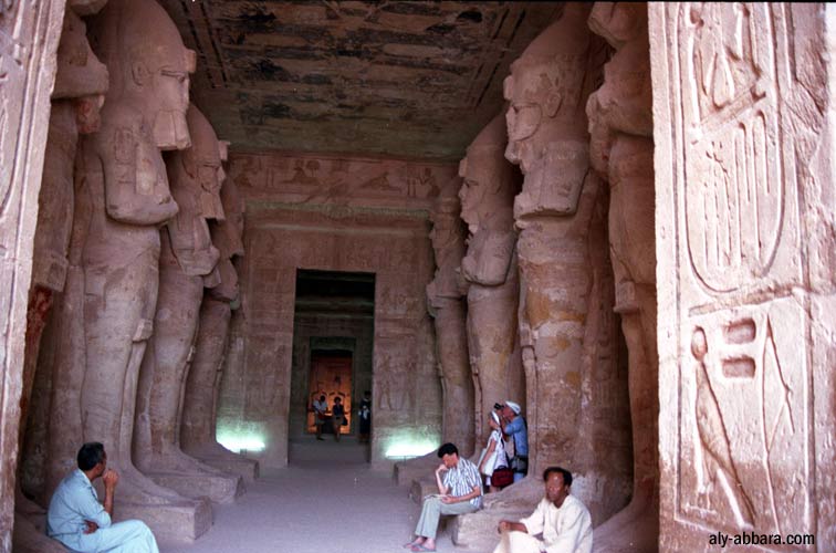 spéos : la vaste salle (17,70 x 16,50 m) à piliers avec ses huit colosses de Ramsès II ; chaque pilier est haut de 8 mètres ; les statues atteignent le plafond et chacune porte un nom