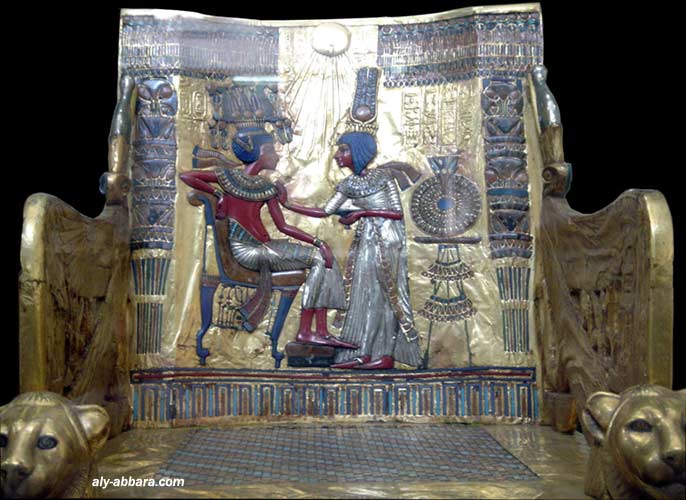 Sur le dossier du trône, Toutankhamon est représenté à côté de son épouse