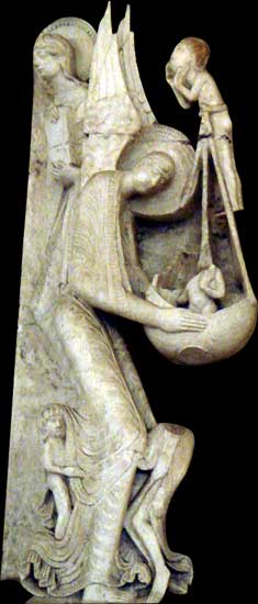 Le Mont Saint-Michel : l'abbaye ; un haut-relief représentant l'archange Saint-Michel psychopompe, pesant les âmes le jour de jugement dernier