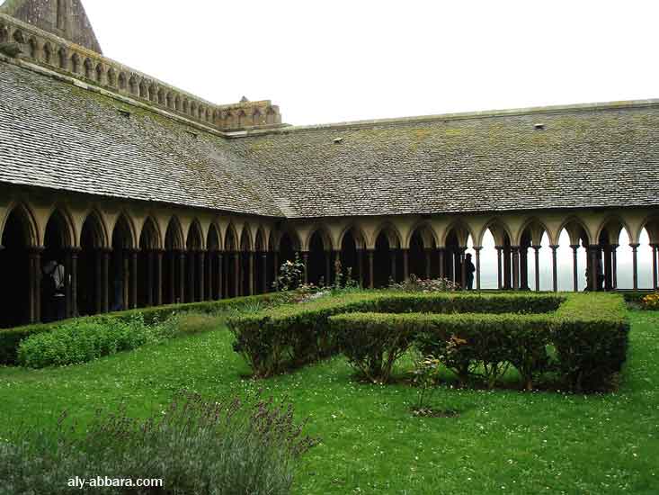 - Au troisième étage de l'abbaye, au même niveau que le réfectoire et l’église abbatiale, le cloître vient clore avec délicatesse cet ensemble gothique surprenant. Il est très différent des autres salles de la Merveille car il s’en dégage beaucoup de subtilité, voire une certaine légèreté. Ses quatre galeries peu élevées s’ouvrent sur un joli jardin intérieur délimité par une double série de 137 colonnettes en granit rose disposées en quinconce, et reliées à leur sommet par des arcs diagonaux. Cela procure un contraste très raffiné entre l’ombre et la lumière. Cette disposition permet aussi de soutenir solidement la toiture en schiste des galeries. À l’intérieur des galeries, l’ensemble des chapiteaux en calcaire est finement sculpté de rosaces de feuillage, à l’intérieur desquels on peut remarquer, de temps à autre, un écoinçon à l’effigie d’un personnage iconographique. Le mur occidental s’ouvre sur trois larges baies avec vue sur la mer. À l’origine, ce passage devait permettre l’accès vers une autre salle (la salle capitulaire) qui ne fut jamais construite