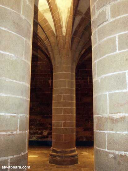 - Cette crypte possède 10 piliers dont huit gros, cylindriques et disposés en demi-cercle d’une circonférence de 5 mètres, et deux colonnes centrales plus minces portant le nom de "palmiers", elles soutiennent le maître-autel. La proximité de chacun des piliers procure à cette salle une impression de massivité. Par contraste, les voûtes offrent un jeu de prismes raffiné qui tranche avec la robustesse des piliers. Cette pièce desservait différentes parties du monastère.