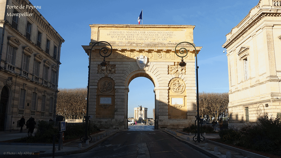 La porte du Peyrou fut édifiée entre 1691 et 1695 en manière d'arc de triomphe à la gloire de Louis XIV.