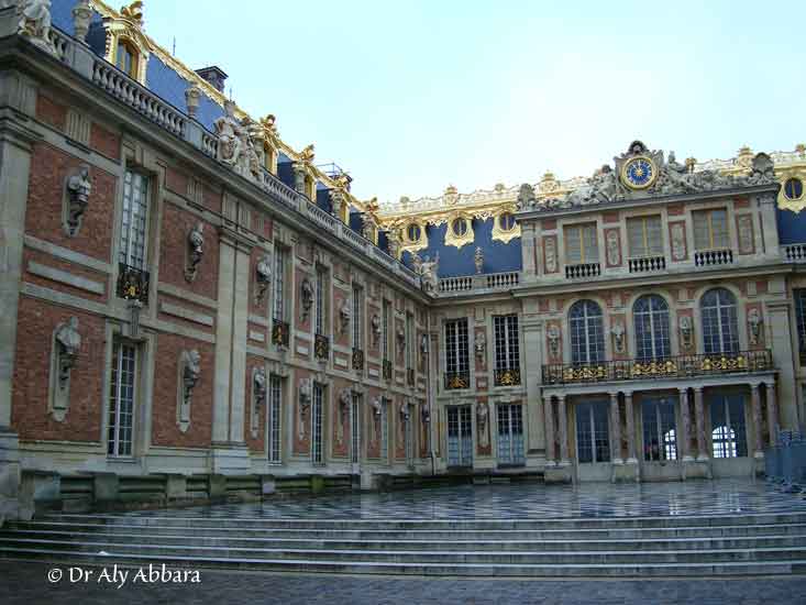 - au premier étage on trouve les trois fenêtres et le balcon de la chambre du Roi, puis à gauche les deux fenêtres de l'antichambre de l'Œil-de-Bœuf