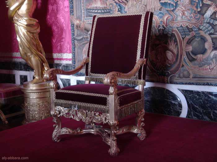 Il s'agit d'un feuteuil en bois doré qui remplaça le trône de Louis XIV, haut de 2,60mètres, fut fondu en 1689.