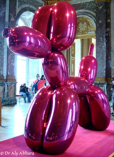 • Les visiteurs du Château de Versailles en décembre 2008, pouvaient admirer l'œuvre-d'art sculptural de Jeff Koons - " Balloon dog " (Magenta) ; 1995 - 2000 - Acier chromé inoxydable - François Pinault Foundation. " exposé au centre du salon d'Hercule.