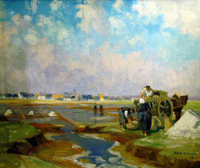 | JIM E. SEVELLEC : Marais salants de Saillé La mise en sacs et le roulage du sel en charrette Huile sur toile, 1947 Collectio du Musée des Marais salants Batz sur Mer - Loire Atlantique - France |