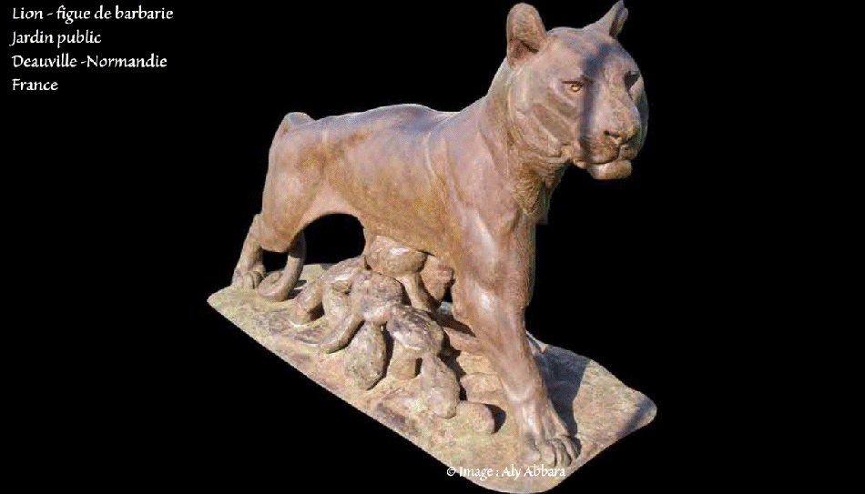 | Jeune lion enjambant un arbrisseau de figue de barbarie Sculpture exposée dans le jardin public parallèle aux Planches de la plage de Deauville Deauville - Normandie - France (artiste à identifier ?) Auteur de l'image : Dr Aly Abbara - avril-2006 Mise à jour : 30 Janvier, 2021 museum.aly-abbara.com |