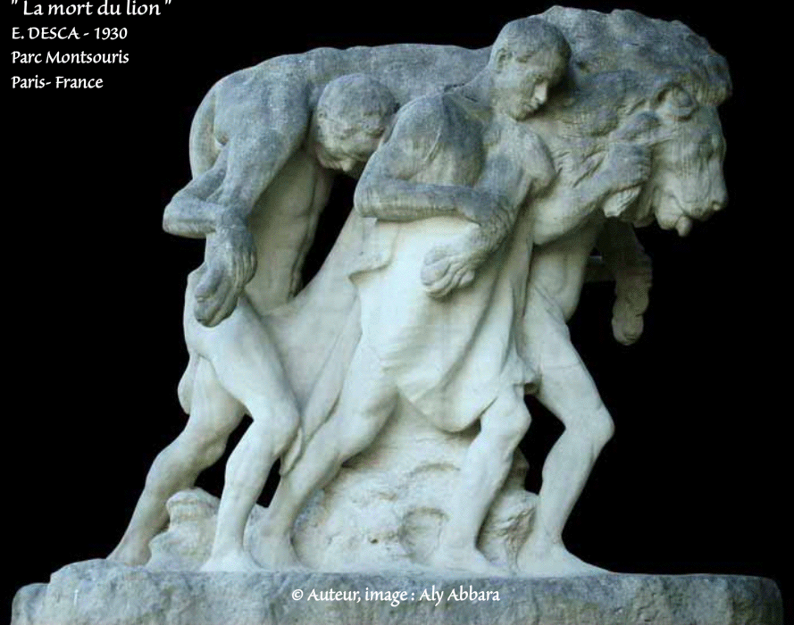 | " La mort du lion " Statue en calcaire d'E. Desca, installée en 1930. Elle représente un lion mort porté par trois hommes africains Parc Montsouris - Paris XIVe - France Auteur de l'image : Dr Aly Abbara Mise à jour : 31 Janvier, 2021 museum.aly-abbara.com |
