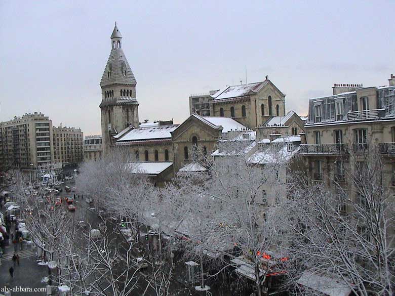 Paris enneigée : Avenue du Général Leclerc et l'égilise de Saint Pierre de Montrouge sur la place d'Alésia ; 04 janvier 2003 France
