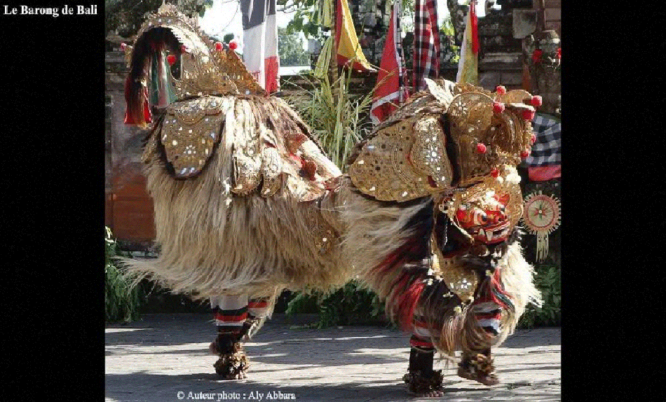 Le Barong est une créature sous forme de lion mythique très stylisé représentant le " Bien" et les " Forces existant sur terre ". Il est habituellement opposé à celui de la " Rangda ", la Reine des sorcières et représentant le " Mal ".