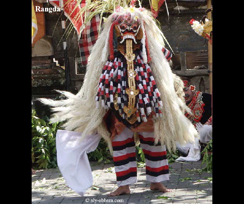Dans une pièce de danse balinaise nommée " Pemaksan Barong Tegaltamu " on représente un des aspects symboliques de lutte sans fin entre les forces du Bien et du Mal comme étant une lutte entre le Barong et Rangda
