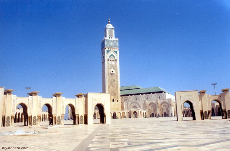 • inaugurée le 30 août 1993 (11 rabi' al-thani 1414 de l'Hégire) ; elle a été érigée à la point occidentale du mode musulman, implantée en partie sur l'océan atlantique, face au soleil couchant. Le site s'étend sur neuf hectares. Durée de construction 7 ans avec la mobilisation de 35 000 ouvriers et artisans effectuant 50 millions heures de travail ; l'ensemble des structures de la mosquée sont en béton armé et habillé de décors artisanaux marocains.