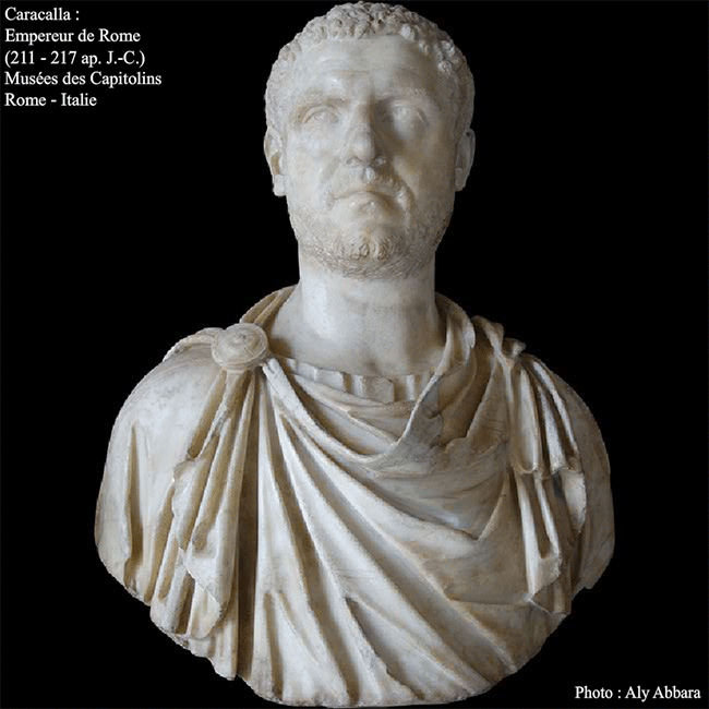 | L'Empereur romain Caracalla (211-217 ap. J.-C.) Le Capitole - Rome - Italie. Fils de l'empereur Septime Sévère ( 193 à 211 ap. J.-C.) et l'impératrice Julia Domna (Émèse 158 - Antioche 217 - جوليا دومنا), fille du Grand Prêtre d'Émèse (Homs - حمص) Il régna avec son frère cadet Géta de 211 à 212 ap. J.-C. |