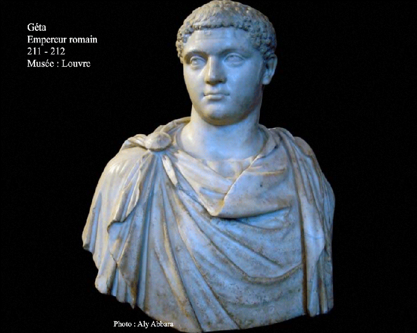 | L'empereur romain Géta (211-212 ap. J.-C.) Fils de l'empereur Septime Sévère ( 193 à 211 ap. J.-C.) et l'impératrice Julia Domna (Émèse 158 - Antioche 217 - جوليا دومنا), fille du Grand Prêtre d'Émèse (Homs - حمص) Il régna avec son frère aîné Caracalla de 211 à 212 ap. J.-C. Musée du Louvre - Paris - France. |
