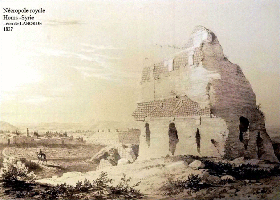 - Commentaire : Située à la lisière du désert de Syrie, Homs était la ville de départ vers Palmyre. Ce dessin montre l'un des deux tombeaux, tours funéraires à plan carré, situés à l'extérieur de l'enceinte médiévale. Un cavalier s'apprête à pénétrer dans la ville par la porte de Tripoli.