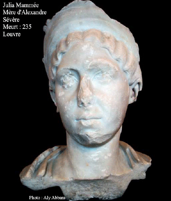 | L’impératrice romaine Julia Mammée (Mammea ou Mamea), la mère de l'empereur Alexandre Sévère (222-235 ap. J.-C.) De la dynastie des sévères fondée par l'empereur Septime Sévère ( 193 à 211 ap. J.-C.) Musée du Louvre - Paris - France. Julia Mammée (Mammea) est originaire de la famille dynastique d'Émèse (Homs - حمص) ; elle est la fille de Julia Mésa (Mæsa) qui n'est que la sœur de l'impératrice Julia Domna. Meurt à Magonce (Syrie) en 235 ap. J.-C. |