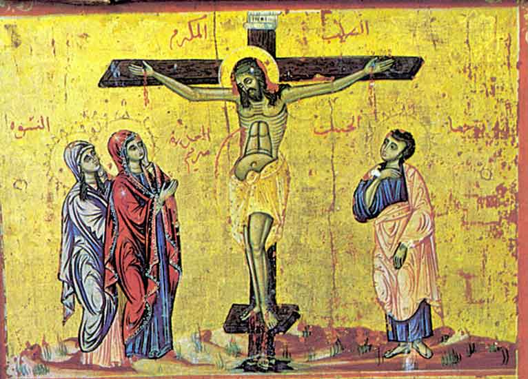 Syrie - Maaloula : le couvent de Mar Sarkis ( Saint-Serge). Une icône présentant la Sainte Croix (الصليب المكرم). L'inscription écrite à côté de Jésus Christ signifie "notre amour - الحبيب - " ; la femme la plus proche du Christ est la Viere Marie - العذراء مريم - l'autre femme représente les femmes (النسوة) et enfin, le personnage placé à gauche du Christ représente Saint Jean (يوحنا)