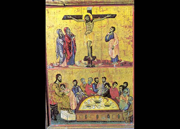 Syrie - Maaloula : le couvent de Mar Sarkis ( Saint-Serge). Une icône présentant la Sainte Croix (الصليب المكرم) et la dernière cène (العشاء السري). La particularité de cette Cène, c'est que Jésus Christ est installé à gauche de la table et non au milieu de ses disciples.