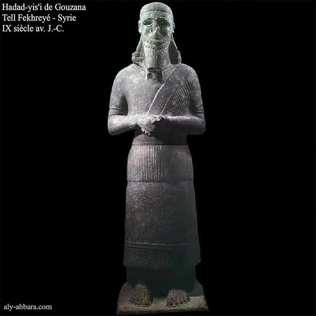- Cette statue d'origine fut découverte en 1979, en dehors de tout contexte archéologique, au nord de la Syrie, à tell Fekhreyé, près des frontières syro-turques aux sources Khabour (rivière, affluant de l'Euphrate, longue de 30 km). L'inscription bilingue en assyrien et en araméen gravée sur la statue indique qu'il s'agit d'un roi d'une dynastie araméenne régnant à Gouzana (Tell Halaf) à la fin du IXe siècle av. J.-C.