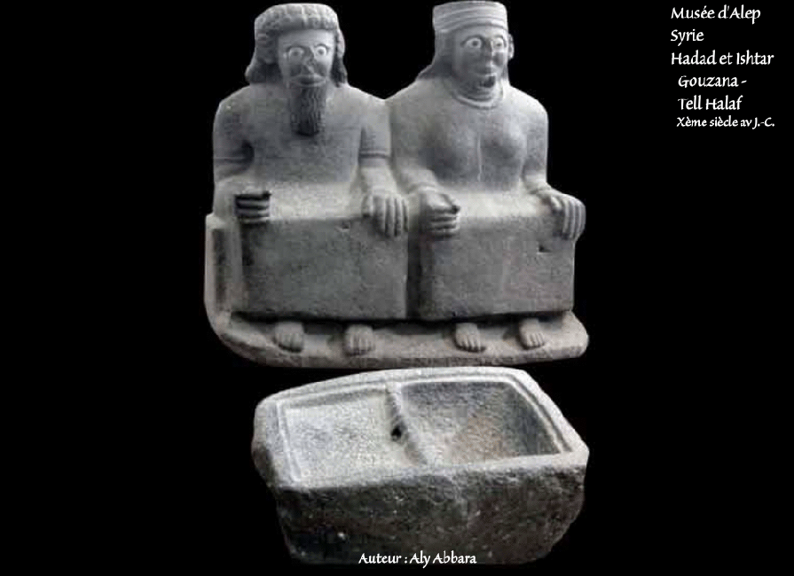| Couple de divinités (statue originale) : le dieu Hadad (dieu de l'orage, de la pluie et des sources) et la déesse Ishtar (déesse de la fertilité et de l'amour) assis devant un récipient en basalte destiné à recevoir le sang des sacrifices offerts par des fidèles. la statue est haut de 80 cm. |
