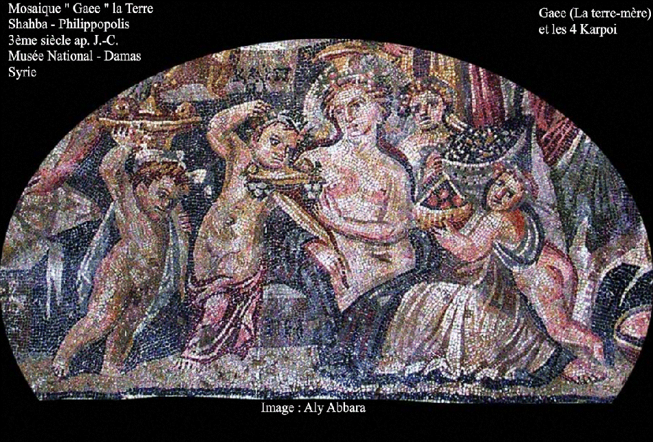 - Le groupe central bas est composé de la déesse-mère, Gê (la Terre) assise à terre, la torse nue, la tête coiffée de calathos et la moitié inférieure du corps est recouverte par le voile bouffant d'Atargatis. La déesse Terre est entourée de quatre enfants portant chacun un plat chargé de fruits, ce sont les Karpoi.