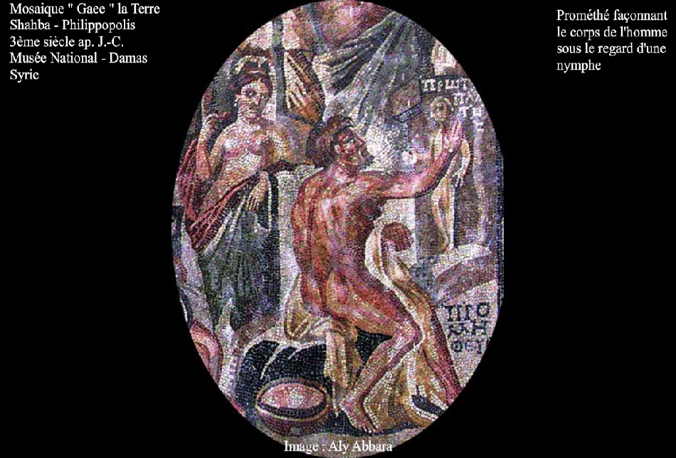 | Prométhée façonnant l'Homme La mosaïque Gê Aiôn et Prométhée (détail) Syrie - Chahba (l'antique ville de Philippopolis) Deuxième moitié du (IIIe siècle ap. J.-C.) Musée National de Damas - Syrie. |
